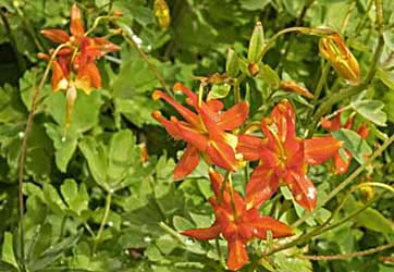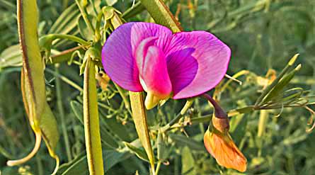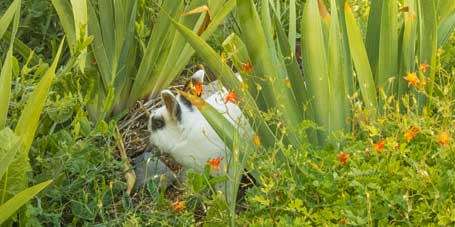 Near the end of summer 2022, a stalemate between columbine and pea flora; columbine with impressive numbers, pea flower with numerous pod support. A neighbor rabbit cautiously hides among an iris plant wall. A lone stranger strayed in late, above.
