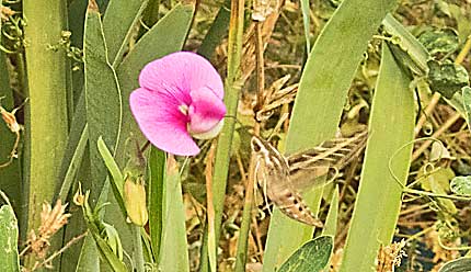 torpedo shaped, creature, top right, probes a wild pea flower; a white