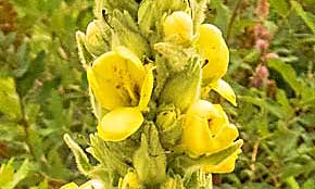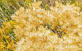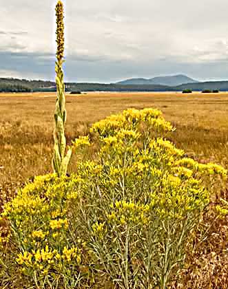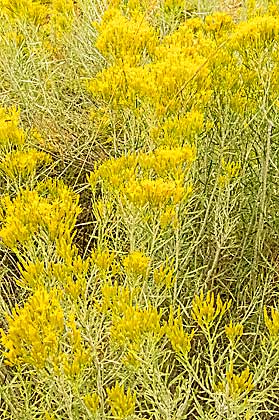 stalk shows its flowers, left. Rabbit brush flowers and seeds, right